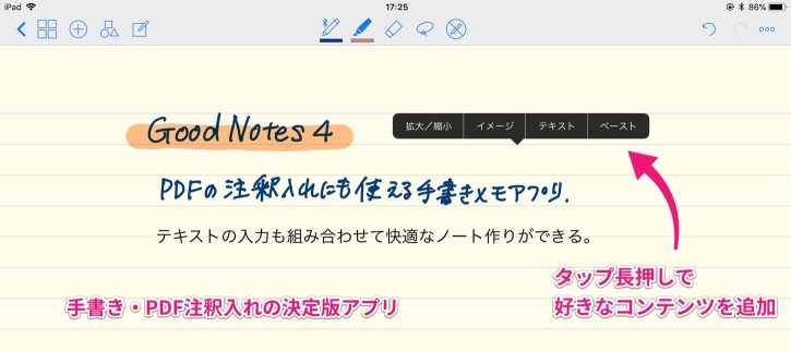 ノートを開いたらすぐ書けて、タッチ長押しすると画像やテキストを簡単に追加できます。操作方法がシンプルで使いやすいのも人気の秘密だと思います。
